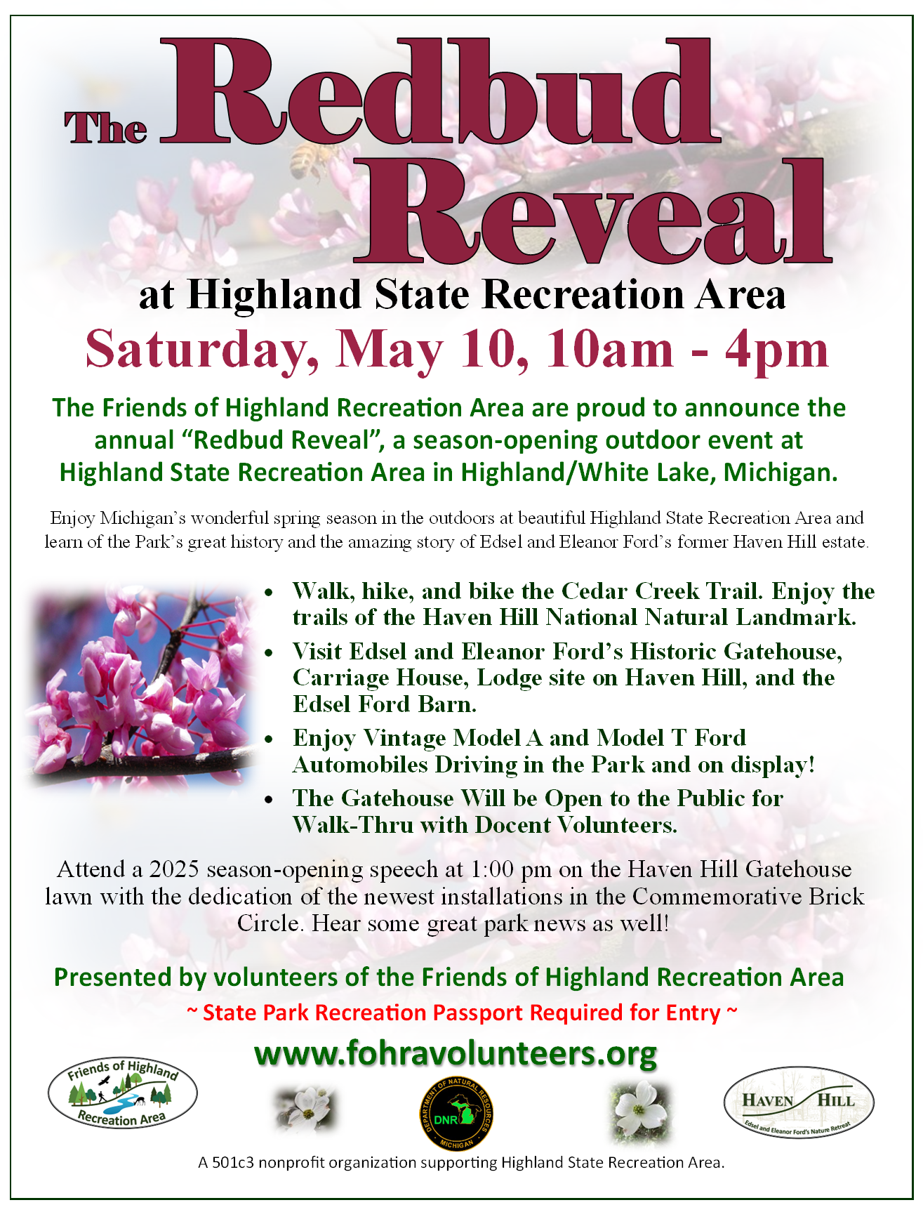 /Our beautiful Michigan redbuds at Highland State Recreation Area are “revealing” their gorgeous blooms all over the park, and especially in the Haven Hill section which is ready for your visit during the annual Redbud Reveal event this coming Saturday, May 10th.